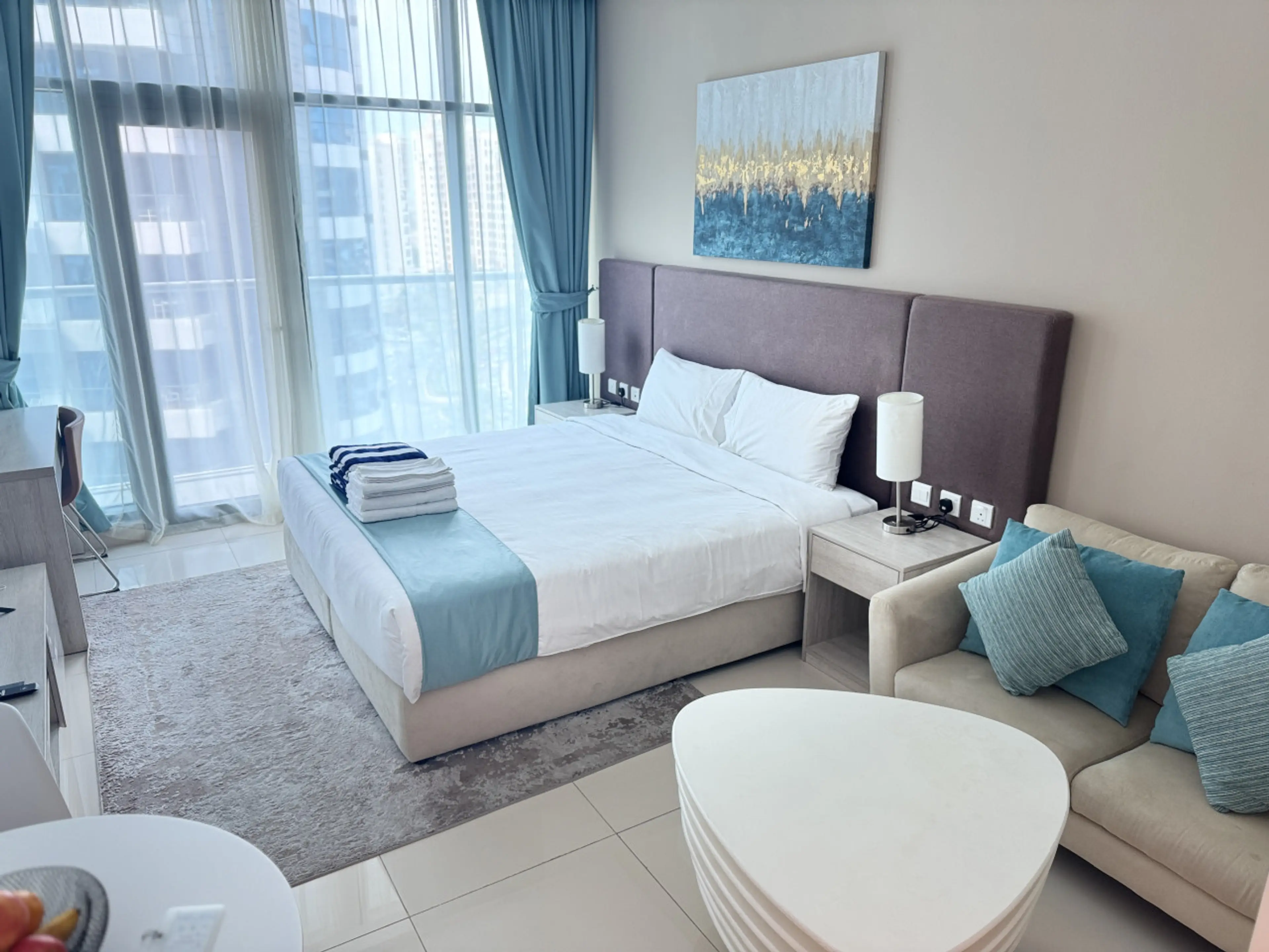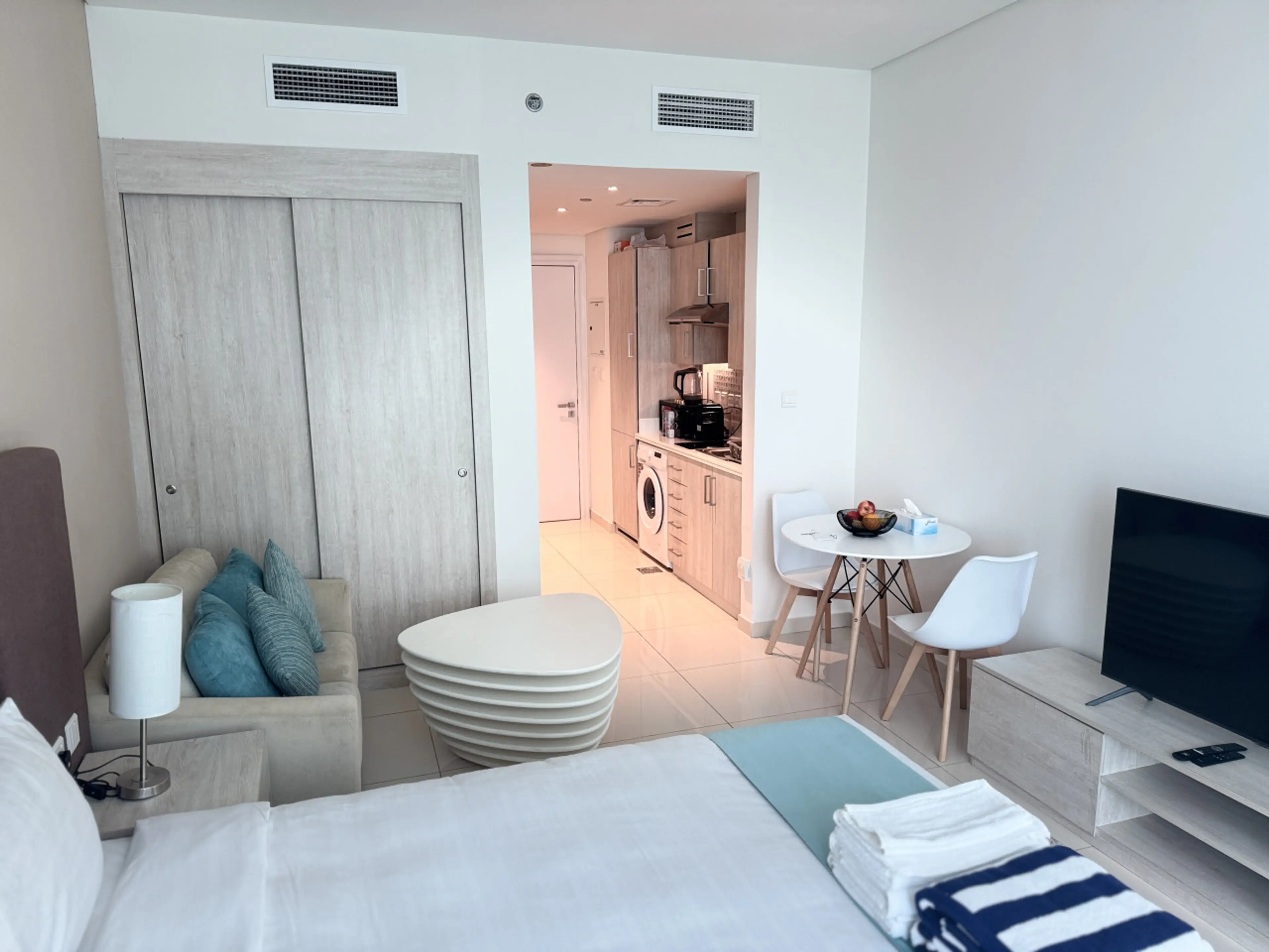 Modern studio in Seven Palm, Palm Jumeirah. Bright and elegant space with a queen-size bed, sofa, smart TV, work desk, dining area and fully equipped kitchenette. Stylish bathroom with amenities provided. Guests enjoy rooftop infinity pool with stunning sea and skyline views, gym, direct beach acces...